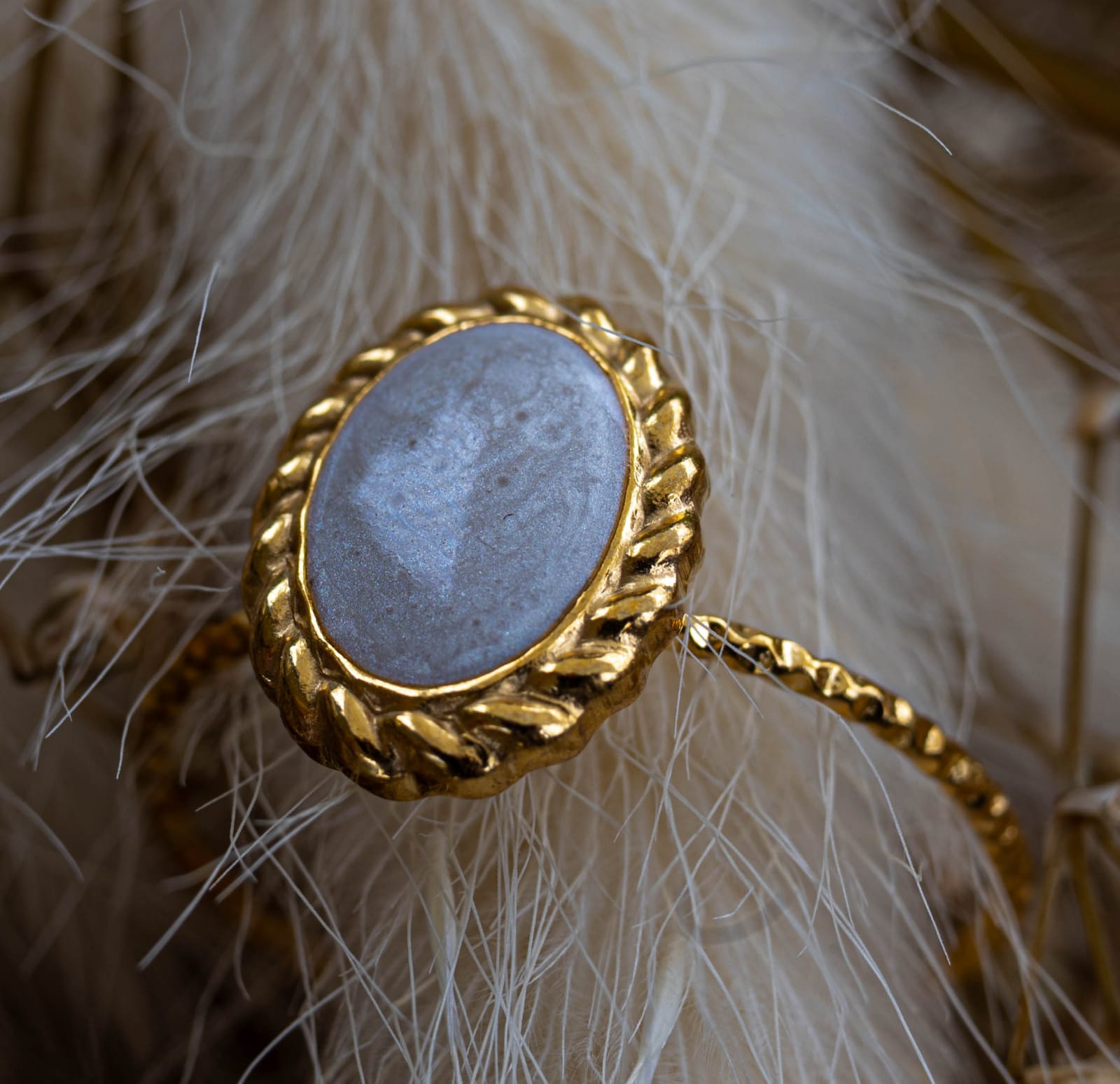 Ein Schmuckstück voller Eleganz: Der goldfarbene Edelstahl-Ring trägt ein ovales Emblem in perlmuttartigem Weiß, das sanft schimmert und den Ring besonders edel wirken lässt. Die feine, goldene Fassung mit zartem Muster setzt den Einsatz perfekt in Szene und unterstreicht seine zeitlose Schönheit.
