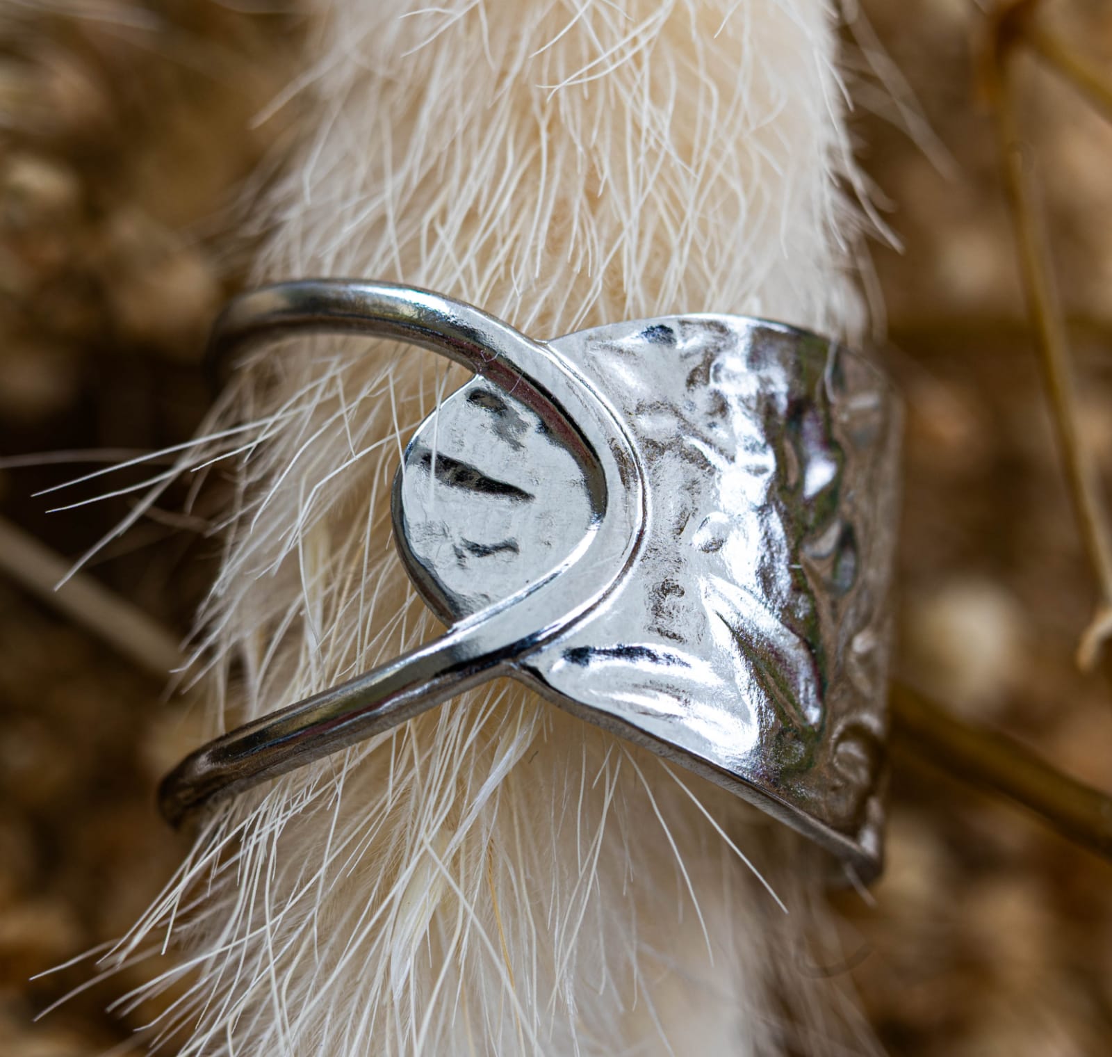 Ein moderner Edelstahlring in glänzendem Silber, geformt zu einer sanft geschwungenen Linie, die an eine elegante Schleife erinnert.