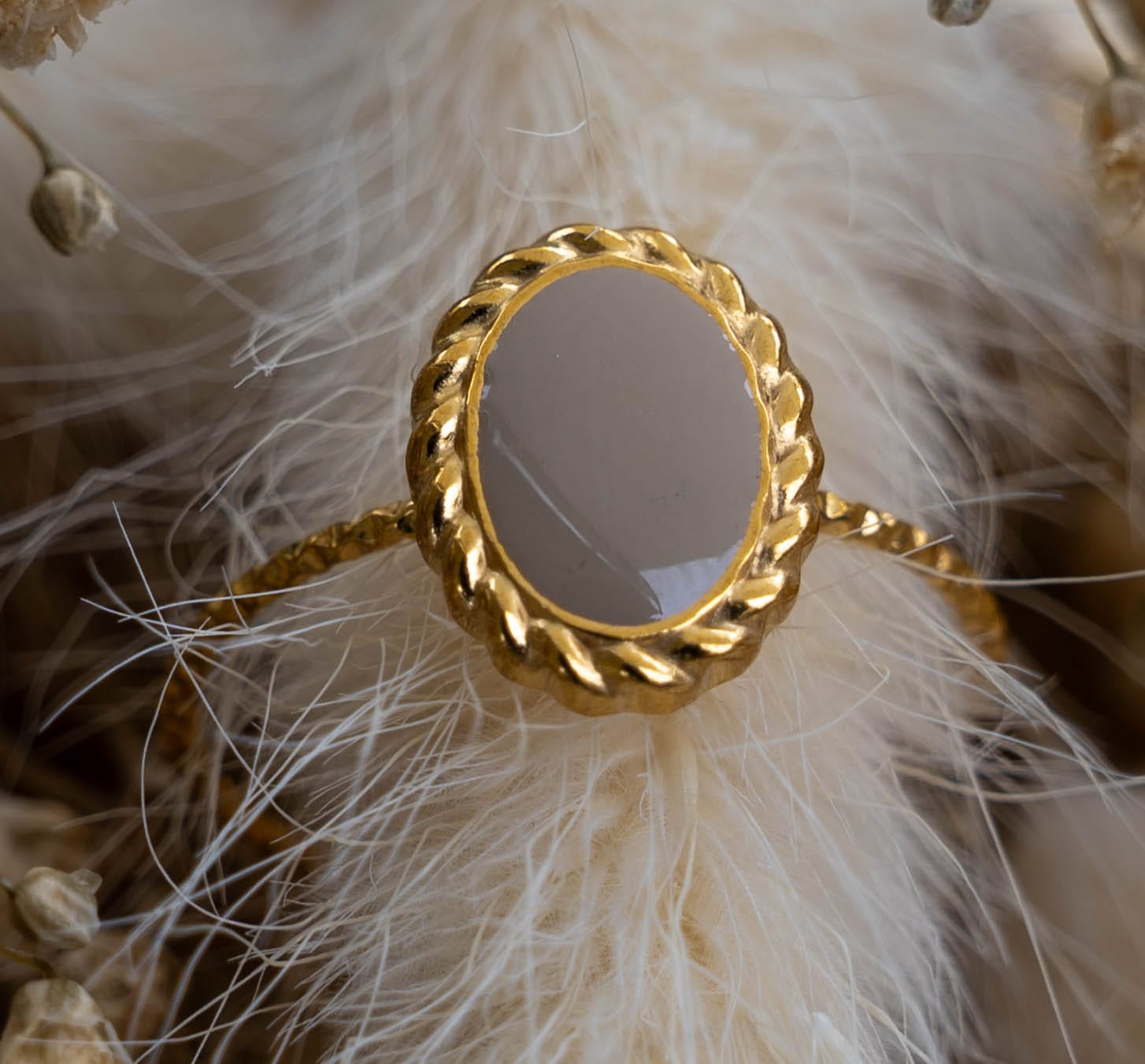 Ein Ring, der klassische Eleganz und moderne Zurückhaltung vereint: Das ovale Emblem in sanftem Beige wird von einer filigranen, goldfarbenen Edelstahlfassung umrahmt. Der zarte Schimmer des Emaille-Einsatzes harmoniert perfekt mit dem edlen Goldton und macht dieses Schmuckstück zu einem stilvollen Allrounder.